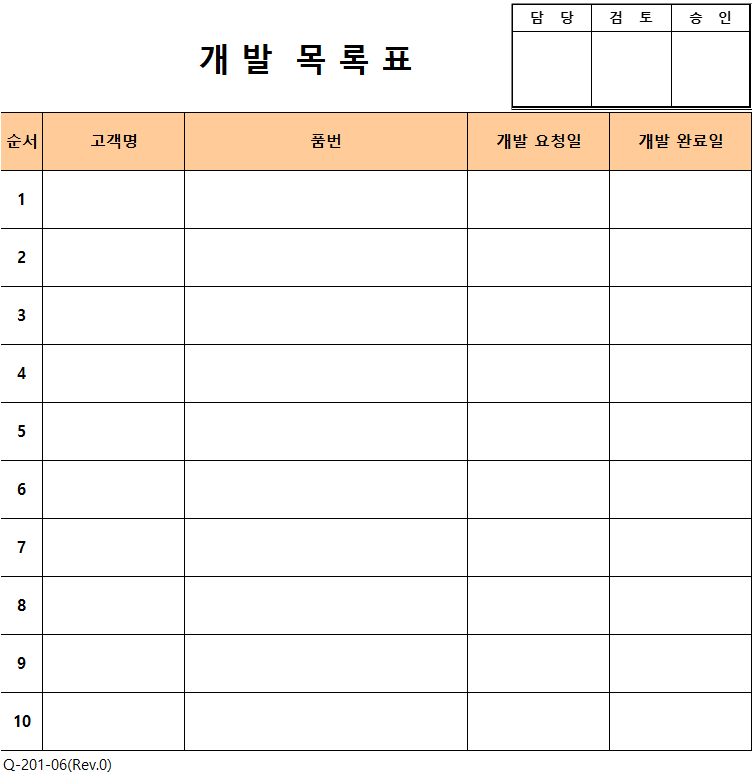 | 순서 | 고객명 | 품번 | 개발 요청일 | 개발 완료일 |