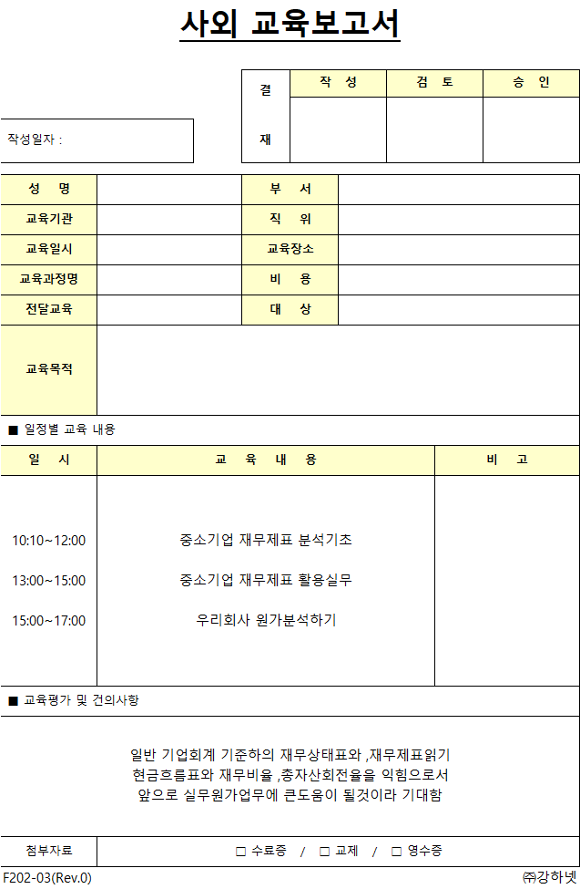 | 첨부자료 | □ 수료증 / □ 교제 / □ 영수증 | ||||||||||